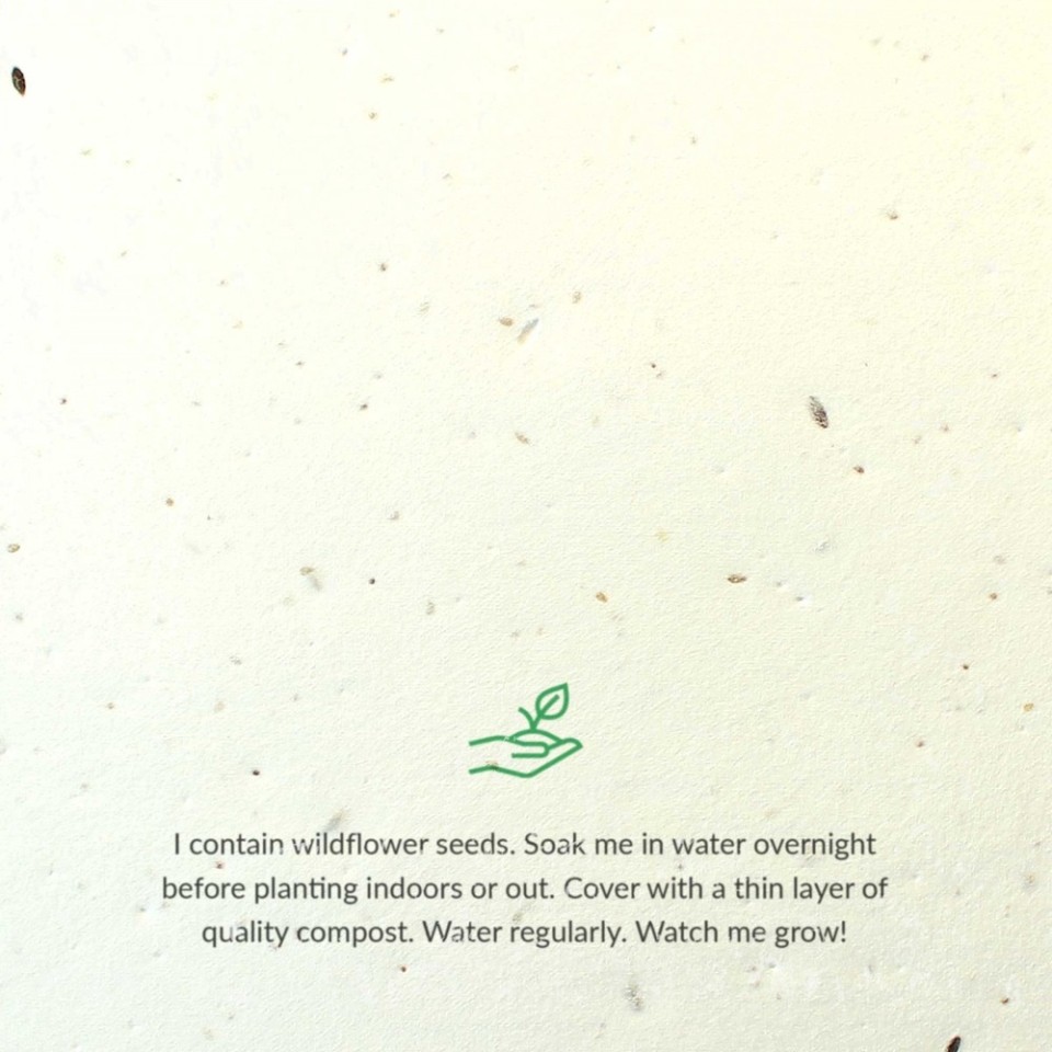 Looking for a unique, sustainable way to invite guests to your next event? Our Seed Paper Invitations are the perfect eco-conscious choice. Printed in full colour onto textured, plantable stock embedded with wildflower seeds, they're designed to be enjoyed twice — first as an invitation, and later as a living memory when planted and bloomed.