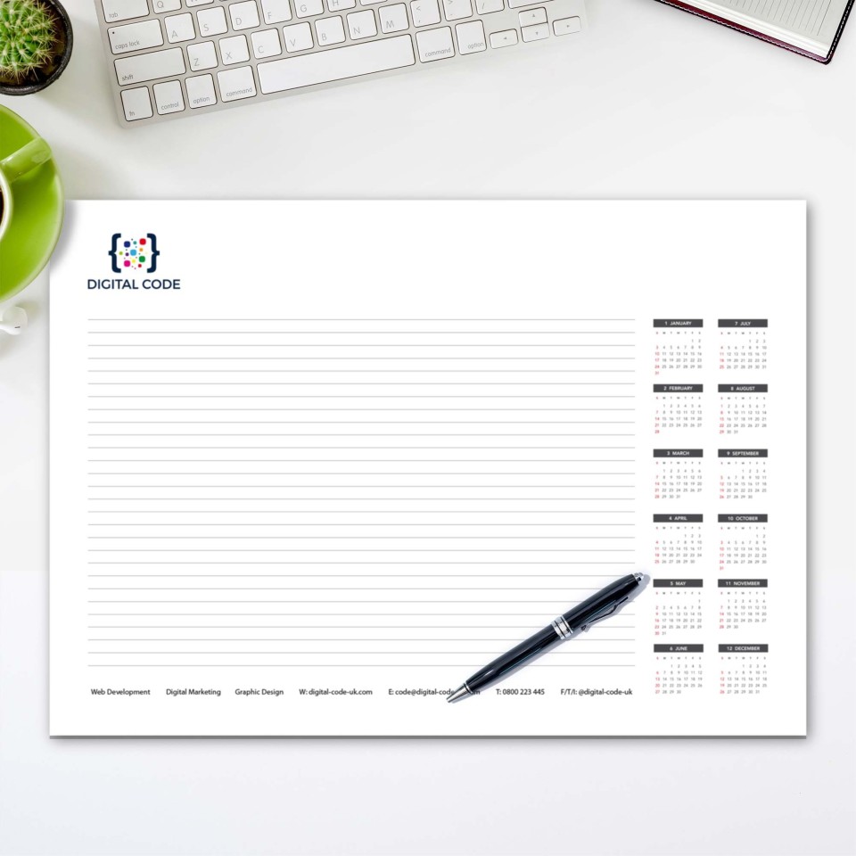 A custom printed desk pad is a great way to smuggle your branding onto the desks of employees, customers and suppliers, year round. Placed centre stage in the middle of their working environment, a desk pad is great for taking notes, checking dates and generally staying on top of things. Emblazoned with your branding, contact details, promotional messages and maybe even product photography, your personalised desk pads will work had to promote your organisation 365 days a year.